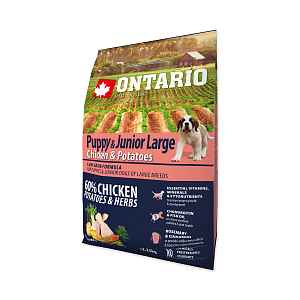 Kompletní, superprémiové krmivo s kuřecím masem, bramborami a bylinkami Ontario Puppy&Junior Large je určené pro štěňata velkých plemen.