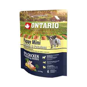 Kompletní, superprémiové krmivo Ontario s kuřecím masem, bramborami a bylinkami pro štěňata malých plemen.