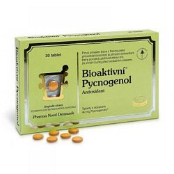 Bioaktivní Pycnogenol obsahuje extrakt z kůry francouzské přímořské borovice (Pinus pinaster), který působí jako antioxidant a chrání buňky před oxidačním poškozením způsobeným volnými radikály. Bioaktivní Pycnogenol obsahuje 40 mg látky v lehce vstřebatelné formě. Doporučuje se užívat první týden 2 tablety denně a dále 1 tabletu denně. Obsahuje 40 mg standardizovaného patentovaného extraktu. Vyrábí se z kůry francouzské středomořské borovice Pinus pinaster. Vyrobeno v Dánsku pod farmaceutickou kontrolou. Složení v 1 tabletě: pycnogenol 40 mg Obsah v 1 tabletě: % doporučené denní dávky v 1 tabletě: Pycnogenol® 40 mg není stanovena Dávkování: Dospělí 2 tablety 2x za den po dobu jednoho týdne, dále 1 tabletu 2x za den. Nepřekračujte doporučenou denní dávku. Vhodná je kombinace s přípravkem Bioaktivní Vitamin C+ Kalcium pH neutrální. Tablety užívat během jídla. Není určeno pro děti. Doplňky stravy nejsou určeny jako náhrada pestré stravy a zdravého životního stylu.