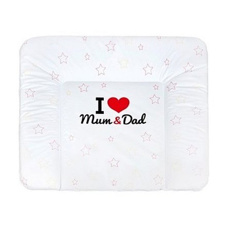 Praktická měkká přebalovací podložka New Baby z nepromokavého, plastového materiálu s obrázkem barevných hvězdiček a nápisem I love Mum and Dad. Rozměr: cca 85x70 cm, tloušťka cca 4 cm.