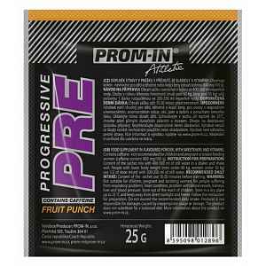 Prom-In Progressive PRE je doplněk stravy ve formě sypkého prášku s příchutí ovocný punč. Jedná se o komplexní předtréninkový produkt s obsahem optimálních dávek prověřených ingrediencí. Obsahuje větvené aminokyseliny BCAA (L-leucin, L-isoleucin a L-valin) v poměru 2:1:1. Větvené aminokyseliny BCAA patří mezi esenciální aminokyseliny, které si lidský organismus nedovede sám vytvořit. BCAA jsou ve svalových vláknech zastoupeny ve 35 % ze všech esenciálních aminokyselin a mohou být využity jako zdroj energie pro svalovou práci.Dále obsahuje stimulační látky v podobě kofeinu a extraktu ze zeleného čaje. Kofein pomáhá zvýšit čilost a hbitost, zlepšuje soustředění a podporuje vytrvalostní výkon. Extrakt ze zeleného čaje přispívá ke kontrole tělesné hmotnosti.Složení je obohaceno o niacin a vitamin B6. Tyto vitaminy skupiny B přispívají ke snížení míry únavy a vyčerpání a normální psychické činnosti. Benefity:komplexní předtréninkový produktaktivní složky tvoří 90 % dávkypro zaručení maximální efektivity tréninkuBalení obsahuje 25 g.