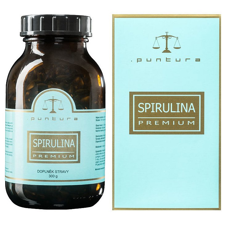Spirulina Puntura Premium 300g, 1.200 tablet Absolutně čistá, sladkovodní modro-zelená sinice Arthrospira Platensis, ve své přirozené podobě. Superpotravina bohatá na proteiny, vitamíny, minerály, karotenoidy a antioxidanty. Vhodná potravina pro vegetariány, vegany a vitariány. Pochází z průzračně čistých vod jezer. Balení obsahuje 1200 tablet.
