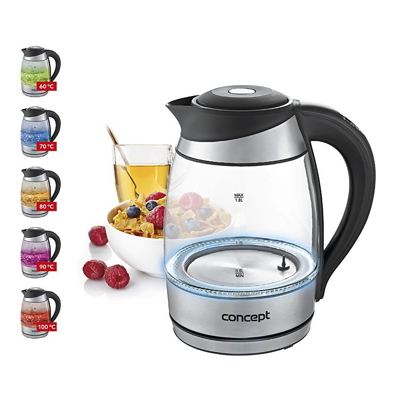 Popis Skleněná rychlovarná konvice RK4065 Concept je vybavena termoregulací, podsvícením v 5 barvách a funkcí udržování teploty.