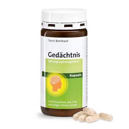Sanct Bernhard Pro podporu paměti jsou kapsle, které zajistí potřebnou výživu pro nervovou soustavu i mozek, aby fungovaly, jak mají. Kapsle obsahují vitamíny skupiny B, jód, zinek, a hlavně také extrakt z Ginkgo biloba. Tyto složky podporují správnou funkci nervové soustavy i psychiky. Zlepšují mozkové funkce, schopnost se učit, pamatovat a posilují i psychickou kondici.