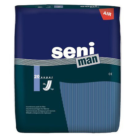 Pánské urologické vložky Seni Man Super jsou unikátní tvarem podobným „lodičce. Díky jednoduchému tvaru je možné upevnění (aplikace) i bez nutnosti jemné motoriky. Vnější vrstva je vyrobena z prodyšného laminátu umožňující pokožce dýchat, vnitřní vrstva je vyrobena z příjemné vlákniny s vysokou savostí. Jsou opatřeny širokým lepicím páskem, který zajišťuje důkladné a stabilní uchycení ke spodnímu prádlu. Lze je dodatečně zajistit elastickými síťovými kalhotkami San Seni. Neobsahují latex. Vysoká savost 800 ml.