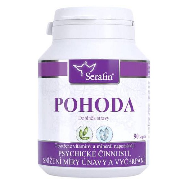 Serafin - byliny s.r.o. Pohoda - přírodní kapsle 90 kapslí Přírodní bylinné tablety sestavené podle originální receptury a chráněné ochrannou známkou jsou určené na podporu správné psychické činnosti a snížení míry únavy a vyčerpání.