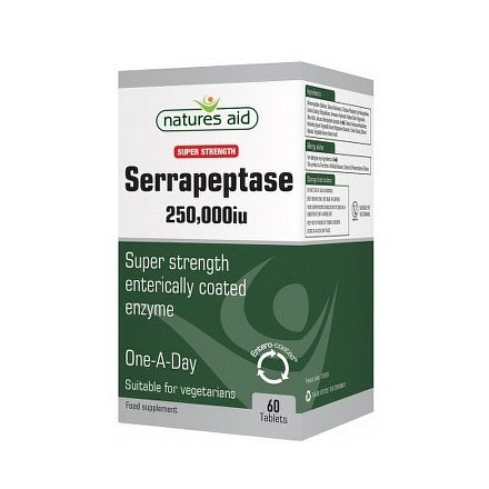 Přípravek Serrapeptáza od britské firmy Natures Aid, je proteolytický enzym (proteáza) produkovaný enterobacteriem Serratia sp. E-15. Balení obsahuje 60 tablet v denní dávce 250 000 iu (100mg).