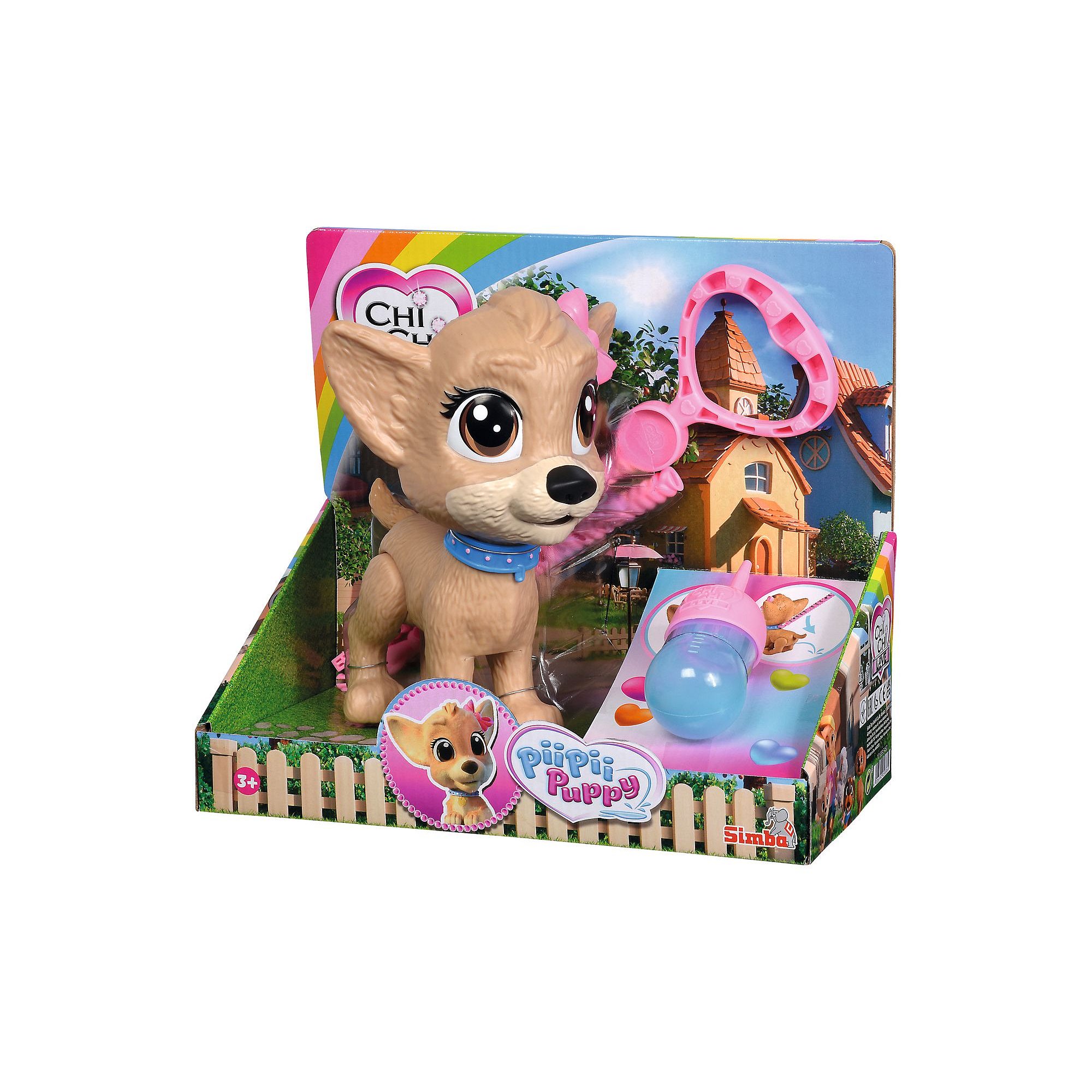 CCL Pejsek čivava Pii Pii Umí dělat loužičky. Dejte pejskovi napít z lahvičky a vyrazte na procházku. Když trošku zatlačíte na vodítko, pejsek pokrčí zadní nohy a udělá loužičku. Balení obsahuje pejska, vodítko a lahvičku na pití. Velikost pejska 20 cm.