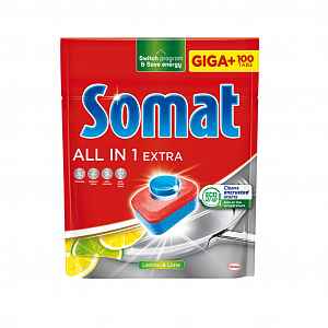Tablety do myčky All in Extra od značky Somat dokonale odstraňují zbytky jídla i zaschlé nečistoty a zanechávají čisté a zářivě lesklé nádobí. Vhodné i na eko programy.