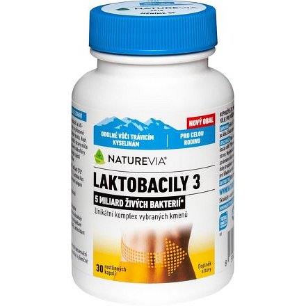 Laktobacily a bifidobakterie (probiotika) se vyskytují v zažívacím traktu a tvoří přirozenou střevní mikroflóru dětí. Střevní mikroflóra ovlivňuje trávení i zdraví organismu. K narušení rovnováhy střevní flóry může dojít např. užíváním antibiotik, změnou stravy nebo prostředí při cestování. Vyvážené prostředí ve střevech je důležité pro přirozenou obranyschopnost organismu proti nepřátelským bakteriím. Swiss NatureVia Laktobacily 3 obsahují komplex 3 vybraných kmenů laktobacilů a bifidobakterií lidského původu ve vysoké dávce 6 miliard životaschopných organismů v 1 kapsli. Jsou vyrobeny patentovanou BIO-SUPPORT™ technologií, která zajišťuje vysokou stabilitu přípravku po celou dobu skladování a vysokou životaschopnost bakterií při průchodu žaludečním traktem až do střeva, kde působí. Přípravek Laktobacily 3 doporučujeme pro péči o správně vyváženou střevní mikroflóru, při a po užívání antibiotik a při cestování nebo nesprávné stravě.