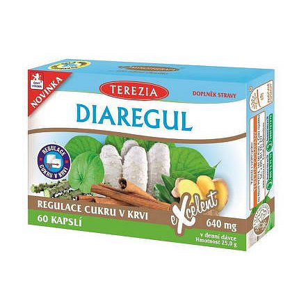 DIAREGUL je unikátní kombinací houby a rostlin. Chebule srdčitá, zázvor lékařský a jalovec přispívají k udržení normální hladiny cukru v krvi. Mohou ho užívat osoby s poruchou glukózové tolerance i lidé trpící nadváhou. Chebule srdčitá pomáhá regulovat hladinu cukru v krvi a podporuje očistný účinek močových cest. Hnojník obecný se vyznačuje zejména vysokou výživnou hodnotou. Zázvor lékařský, skořice a jalovec pomáhají udržovat normální hladinu cukru v krvi. Složení: 1 kapsle obsahuje 320 mg směsi DIAREGUL [prášek sušené houby hnojníku obecného (Coprinus comatus) 150 mg ,extrakt chebule srdčité (Tinospora cordifolia – GUDUCHI) 80mg, prášek sušeného zázvoru (Zingiber officinale) 50 mg, sušená skořice (Cinnamomum zeylanicum) 20mg, prášek sušeného jalovce obecného (Juniperus communis) 20 mg]. Obal kapsle: želatina. Dávkování: 1 kapsle 2x denně před jídlem. Kapsle se polykají celé a zapíjí vodou, nebo se rozdělí a obsah se nasype do jídla nebo do vody.