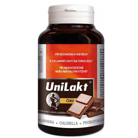 Unilakt čoko jsou tablety s kakaovou vlákninou, s řasou Chlorella a probiotickou kulturou, doplněk stravy.