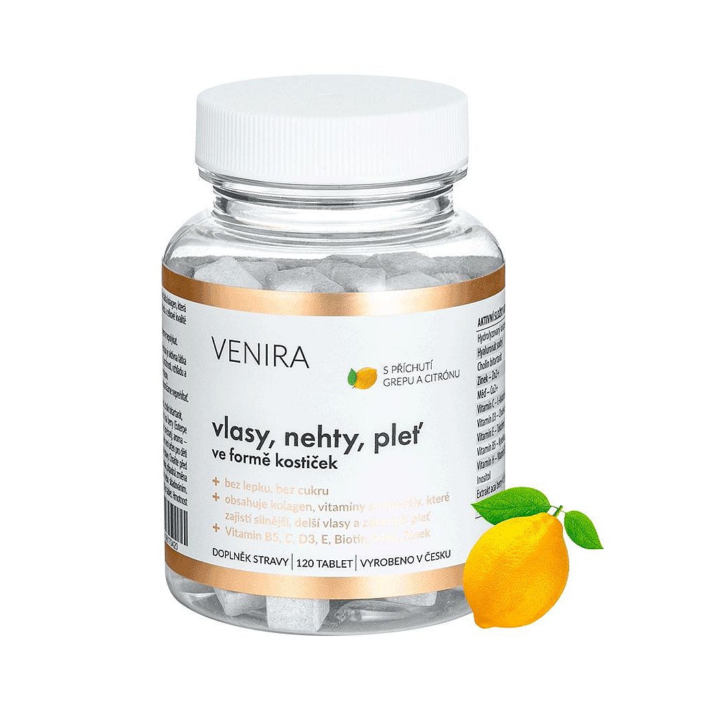 Venira Vlasy, nehty, pleť ve formě kostiček obsahuje kolagen, vitaminy a stopové prvky pro Vaši přirozenou krásu. Cucavé tablety s ovocnou chutí pro rychlejší vstřebání.