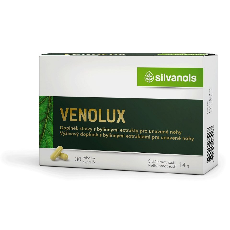 Venolux je doplněk stravy, který obsahuje bylinné extrakty z kaštanu koňského, jinanu dvoulaločného a zeleného čaje. Koňský kaštan přispívá ke snížení pocitu těžkých nohou, podporuje krevní oběh a prokrvení. Jinan dvoulaločný podporuje mikrocirkulaci krve. Zelený čaj příznivě působí na pružnost cév a tonus organismu. Balení obsahuje 30 tobolek. Hmotnost: 14 g.