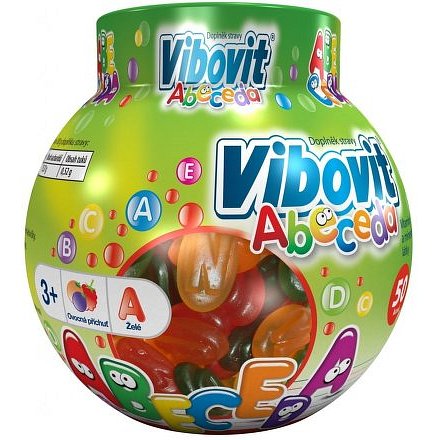 Vibovit obsahuje komplex 11 vitamínů a minerálních látek s vynikající ovocnou chutí pro všechny aktivní děti. Jedno želé obsahuje 50 % doporučené denní dávky vitamínu C, niacinu, vitamínu E, zinku, kyseliny pantothenové, vitamínu A, kyseliny listové, selenu, biotinu, vitamínu D a vitamínu B12. Vibovit je doporučován hlavně všem aktivním dětem, jejichž pravidelná fyzická zátěž zvyšuje požadavky na příjem těchto látek. Obsahuje pouze přírodní barviva. Dávkování: Děti od 3 let užívají 1-2 želé denně. Složení: 1 želé bonbón obsahuje: Hmot.