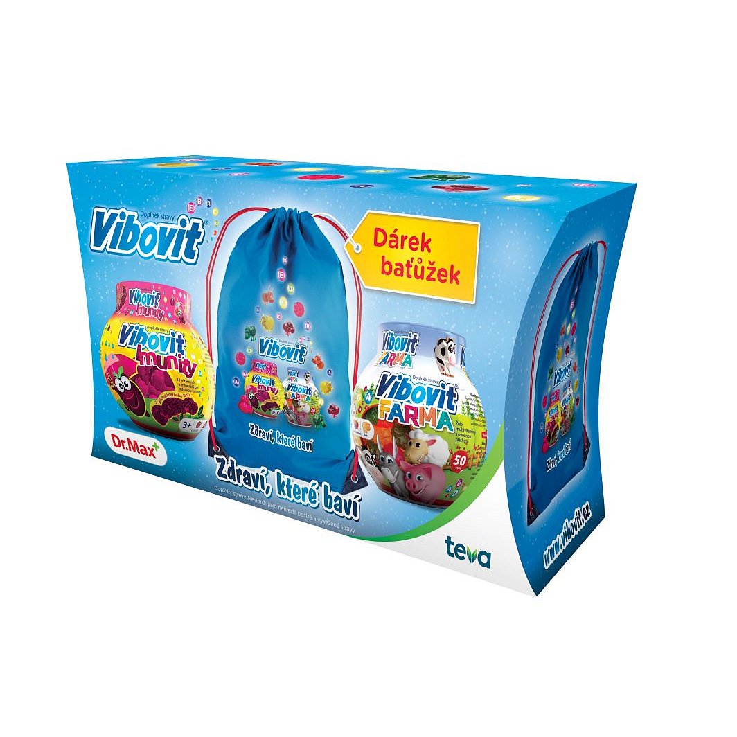 Oblíbené želatinové bonbóny Vibovit ve vánočním balení se stahovacím batůžkem jako dárek. Balení obsahuje přípravky Vibovit Imunity a Vibovit Farma. Pro děti od 3 let.
