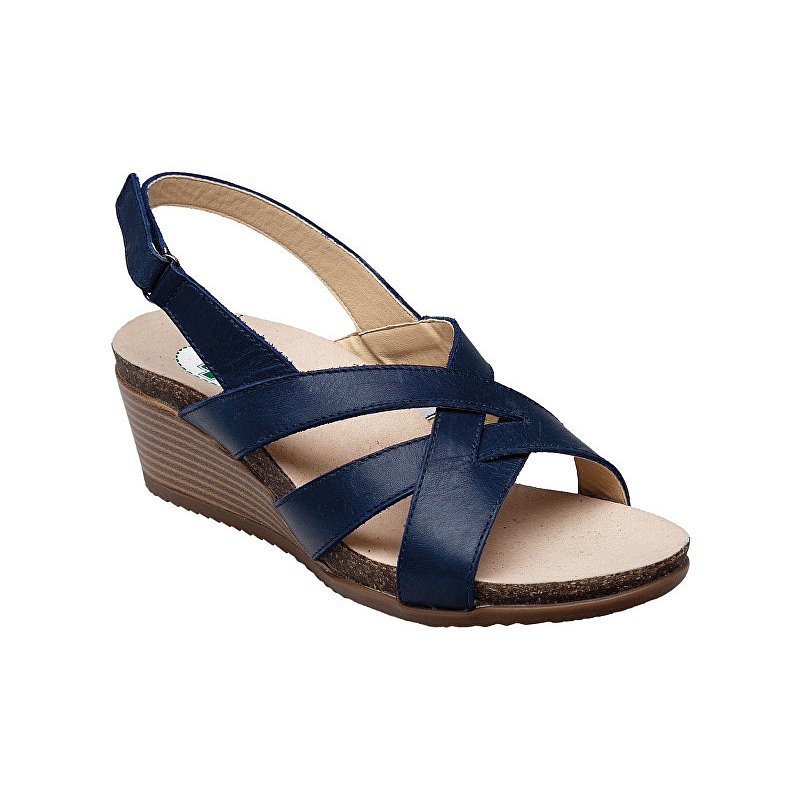 Zdravotní obuv - dámské vycházkové sandále, barva: modrá, podrážka: béžová, svrchní materiál: kůže, stélka: kůže, klínek cca 5,5 cm, pásek za patou lze nastavit pomocí suchého zipu.
