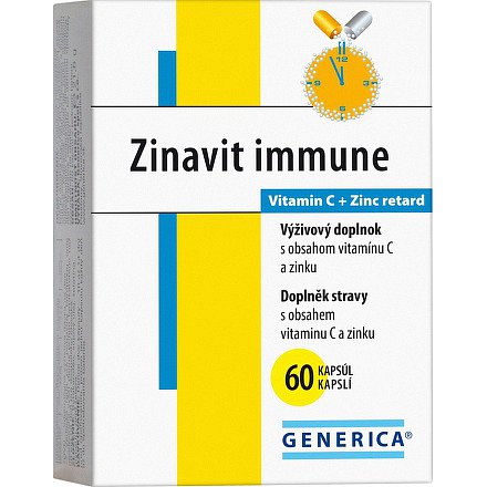 Vitamin C a zinek k normální funkci imunitního systému. Látky: Vitamin C 300mg Zinek 5mg (ve vodě rozpustná, vstřebatelná forma zinku) 1 balení: 60 kapslí. Dávkování: 1 kapsle denně. Poznámka: Kapsle obsahují „perličky“ s postupným uvolňováním, které uvolňují účinné látky postupně a tím zajišťují dávky vitaminu C a zinku plynule během celého dne. Upozornění: Není určeno jako náhrada pestré stravy. Nepřekračujte doporučené denní dávkování. Uchovávejte mimo dosah dětí! Zdroj: www.generica.